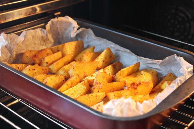 Ułóż ziamniaki na blasze wyłożonej papierem do pieczenia. Ziemniaki piecze się na środkowej półce piekarnika nagrzanego do 220-230 °C przez 15 minut.