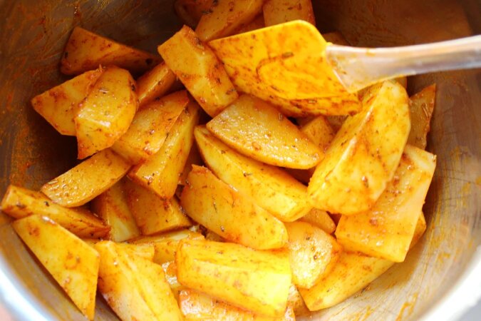 Gdy ziemniaki ostygną, dodaj olej do mieszanki przypraw, dobrze wymieszaj i wsyp kawałki ziemniaków do powstałej masy. Bardzo dobrze wymieszaj, aby przyprawy „przykleiły się” do plasterków ze wszystkich stron. Jeśli ziemniaki są mokre, olej nie przywiera się.