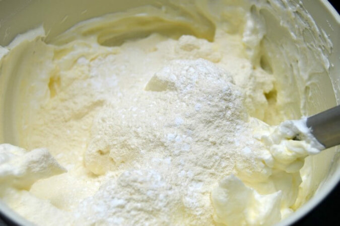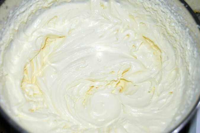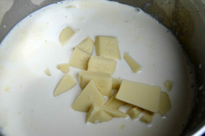 1. Śmietanę podgrzać na wolnym ogniu i zagotować. Zdejmij z ognia i dodaj białą czekoladę do śmietany. Mieszaj, aż czekolada całkowicie się rozpuści i ostudź śmietanę do temperatury pokojowej. Schłodzony krem wstawiamy do lodówki na 3 godziny, następnie ubijamy go, aż stanie się elastyczna pianka (około 3 minuty).