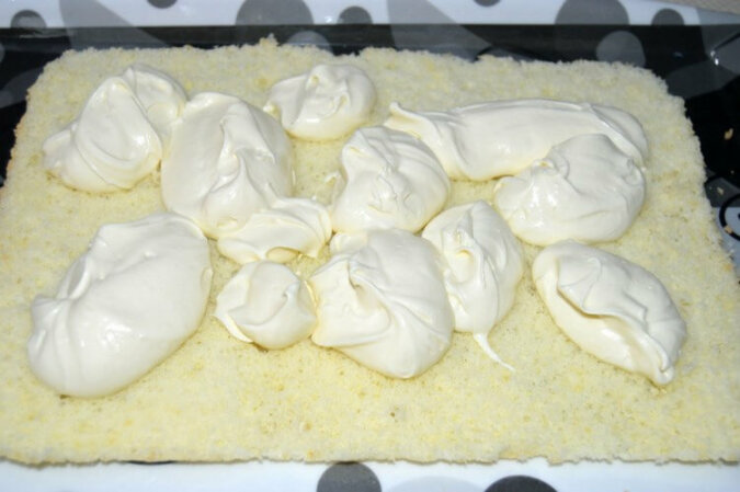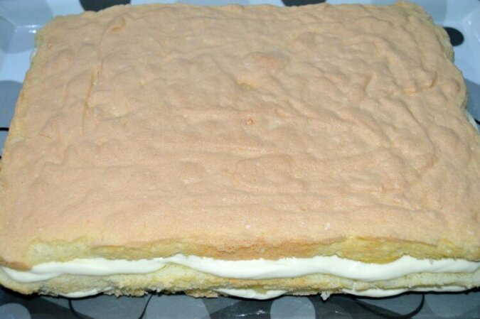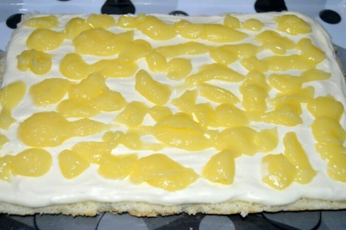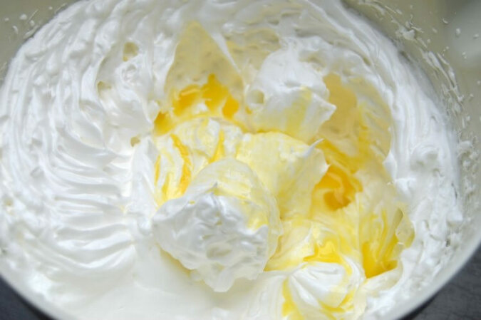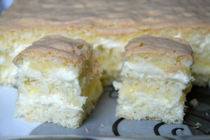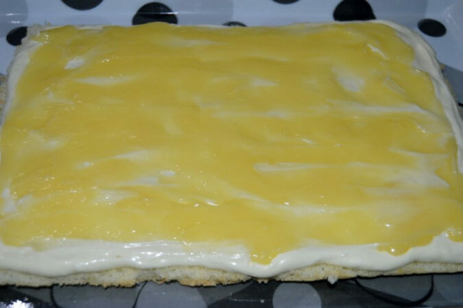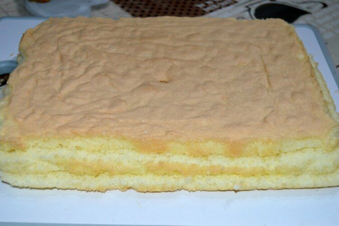 3. Ubij białka jaj ze szczyptą soli i cukru. Kontynuując mieszanie dodaj żółtka wymieszane z olejem roślinnym (odrobiną), esencją cytrynową i mąką z proszkiem do pieczenia. Połóż papier do pieczenia na dnie naczynia do pieczenia (20x30 cm) i piecz ciasto w 170 stopniach, około 25-30 minut. Schłodzić ciasto i pokroić poziomo na 3 równe warstwy.