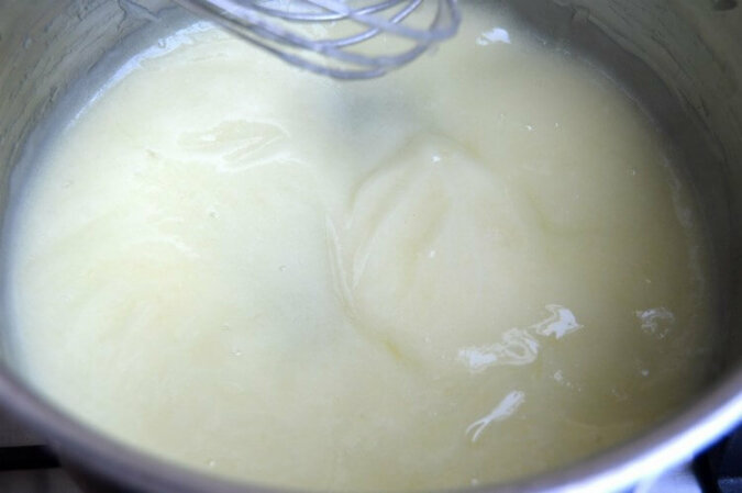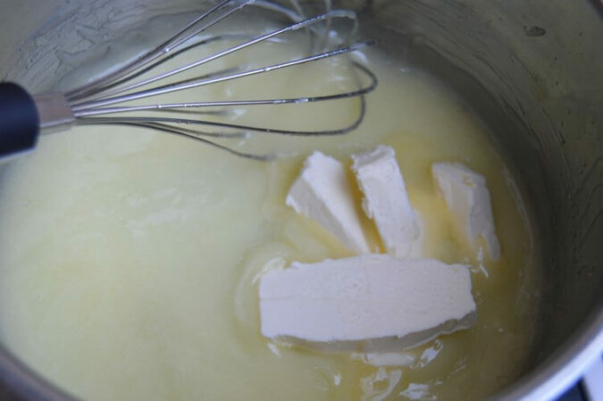 2. Zagotuj sok z cytryny razem z cukrem na małym ogniu, ciągle mieszając, aż cukier całkowicie się rozpuści. W osobnej misce ubij 2 jajka i dodaj do nich gorący syrop cytrynowy (cienkim strumieniem). Umieść mieszankę na małym ogniu i gotuj przez kolejne 5 minut. Zdjąć z ognia i dodać masło, od czasu do czasu mieszając, aż masło całkowicie się rozpuści, a masa będzie gładka. Przykryj krem folią spożywczą i ostudź.