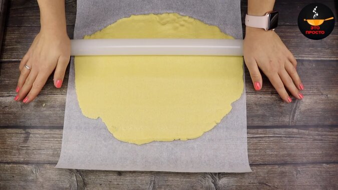 Ciasto rozwałkujemy od razu na papierze do pieczenia. Ciasto najpierw lekko rozciągamy na boki rękami, a następnie rozwałkowujemy wałkiem w warstwę o grubości 5 mm. Obcinamy brzegi tak, aby ciasto było wszędzie tej samej grubości. Moja warstwa ma wymiary 30x35 cm. Ciasto przekładamy na blachę do pieczenia i nakłuwamy widelcem.