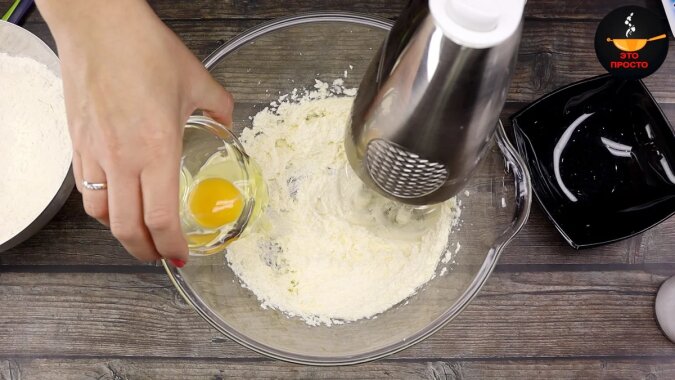 Następnie dodaj 130 g cukru i saszetkę waniliny (1,5 g) i ubijaj przez 2-3 minuty, aż się rozjaśnią. Następnie wbij 1 jajko w kremową masę i kontynuuj ubijanie przez trzy minuty. Masa stanie się jeszcze bardziej puszysta.