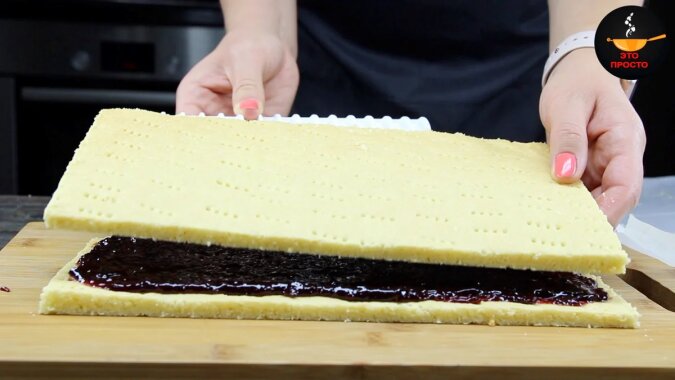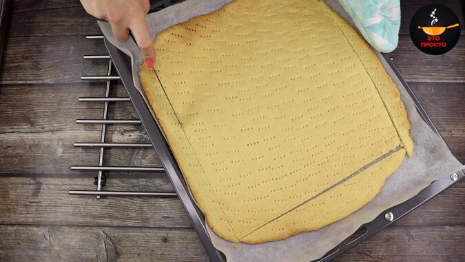 Wstawiamy do pieczenia w piekarniku nagrzanym do 200 stopni przez 10-12 minut. Gdy tylko brzegi ciasta się zrumienią, natychmiast je wyjmujemy. A gdy ciasto jest jeszcze gorące, odetnij nierówne krawędzie i pokrój na 2 części. Teraz zostawiamy do całkowitego ostygnięcia.