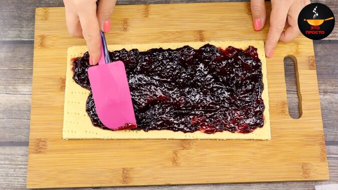 Połowę dżemu nakładamy na ciasto i za pomocą łopatki lub łyżki rozprowadzamy równomiernie po całej powierzchni ciasta, jednocześnie lekko oddalając się od brzegów, aby dżem nie wypływał, gdy połóżymy drugie ciasto na wierzchu.