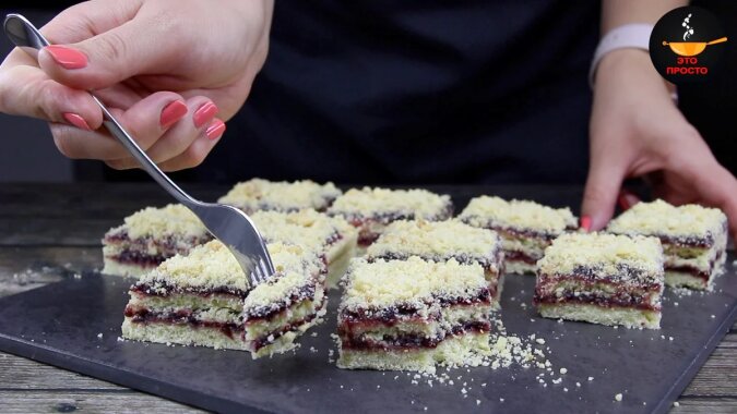 Teraz kładziemy drugą warstwę ciasta, pokrywamy dżemem, ale już całkowicie, bez odchodzenia od krawędzi. Posyp ciasto powstałym miękiszem na wierzchu i w tej formie pozostaw na 2-3 godziny w temperaturze pokojowej. Powinno dobrze się nasączyć. Następnie kroimy go na małe kwadraty i zapraszamy rodzinę na herbatę.
