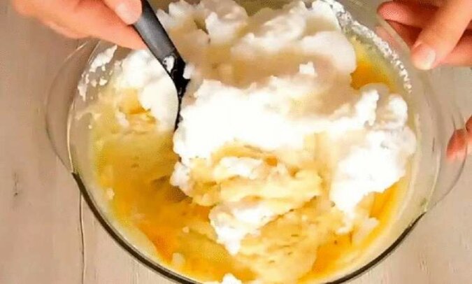 Wsyp przesianą mąkę, proszek do pieczenia i ugnieć do gładkości. Białka ubij mikserem do stabilnych pików i delikatnie wymieszaj z ciastem.