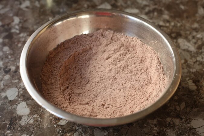 Do głębokiej miski przesiej mąkę, kakao i proszek do pieczenia i dodaj cukier. Wszystko dobrze wymieszaj. Polecam użyć dobrej jakości proszku kakaowego, wtedy gotowe ciasto uzyska bogatszy czekoladowy odcień i smak.