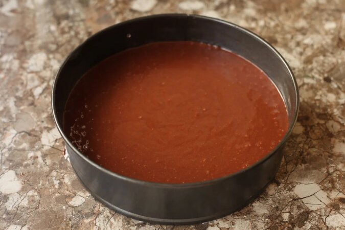 Teraz weź dowolne naczynie do pieczenia (oczywiście wygodniej jest użyć rozkładanej formy), posmaruj niewielką ilością oleju, można nawet posypać odrobiną mąki. Wlej ciasto do przygotowanej formy i wstaw piec się w nagrzanym piekarniku.