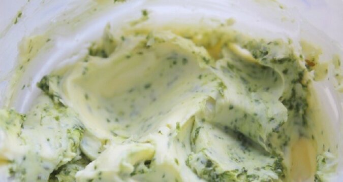 Teraz przygotuj nadzienie: do drobno posiekanej zieleniny (koperek, natka pietruszki lub bazylia) należy dodać olej i dokładnie wymieszać. Zatem masło owinąć w folię spożywczą i włożyć na 15 minut do zamrażarki.