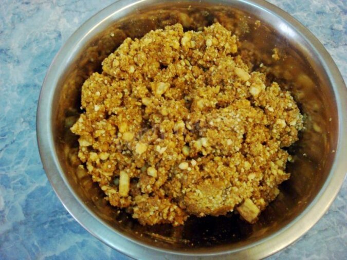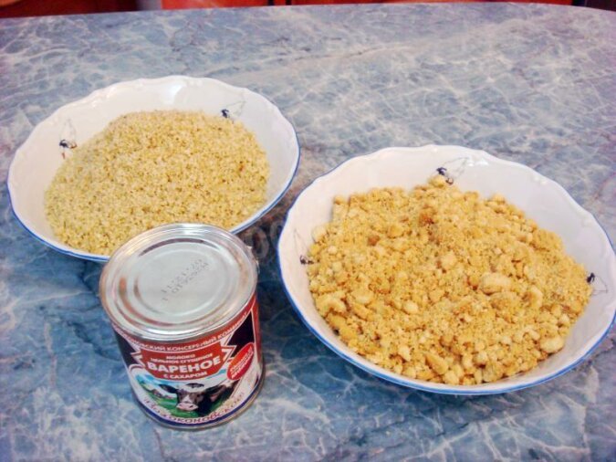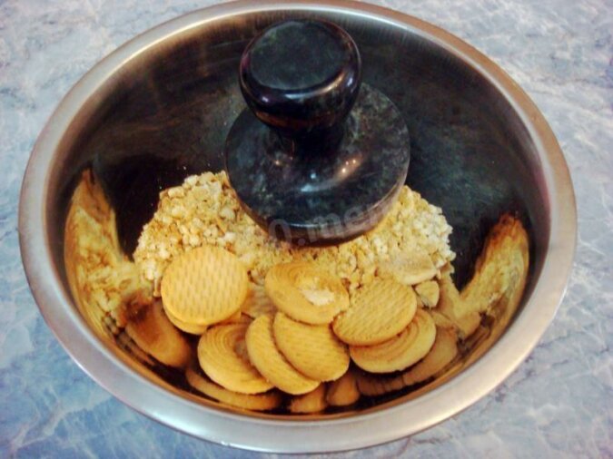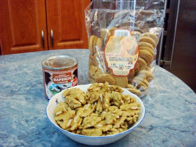 Skondensowane mleko należy połączyć z orzechami i ciastkami.