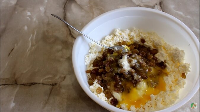 5. Przygotuj nadzienie. Twaróg zmielić z cukrem i 1 jajkiem. Mak i rodzynki są opcjonalne.