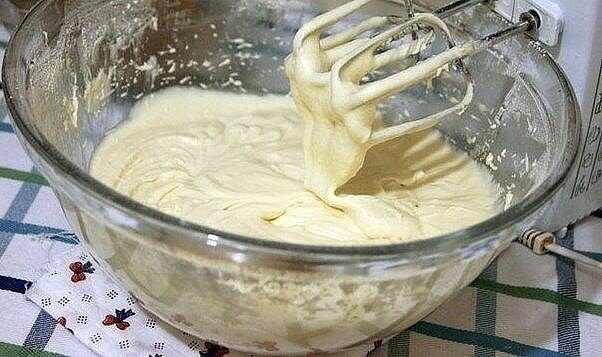 1. Jajka ubij blenderem z cukrem na puszystą masę. Dodaj śmietanę i roztopione masło, następnie wanilinę, proszek do pieczenia i mąkę. Wszystko dobrze wymieszaj.