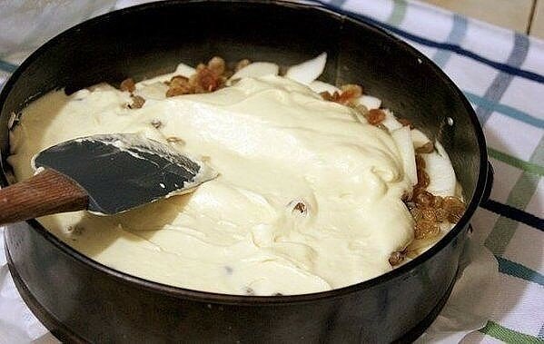 3. Weź formę, posmaruj olejem i posyp bułką tartą. Następnie wlej połowę ciasta do formy. Na wierzchu ułożyć jabłka i rodzynki.