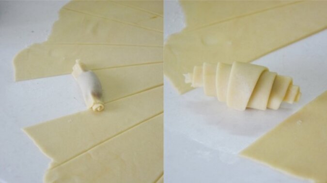 Teraz ciasto należy delikatnie zwinąć, docisnąć rogi, aby zapobiec wydostawaniu się nadzienia, a następnie otrzymany wałeczek wygiąć na kształt rogalika.