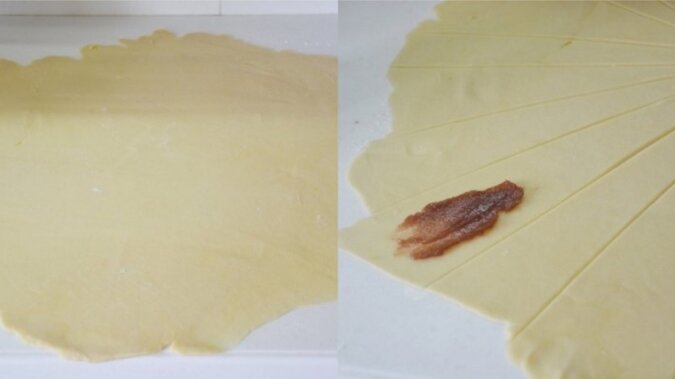 Podziel ciasto na 6 części. Każdą z nich rozwałkuj na jednakowe placki, a zatem pokrój na sektory.