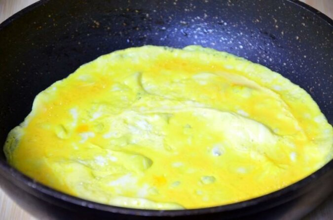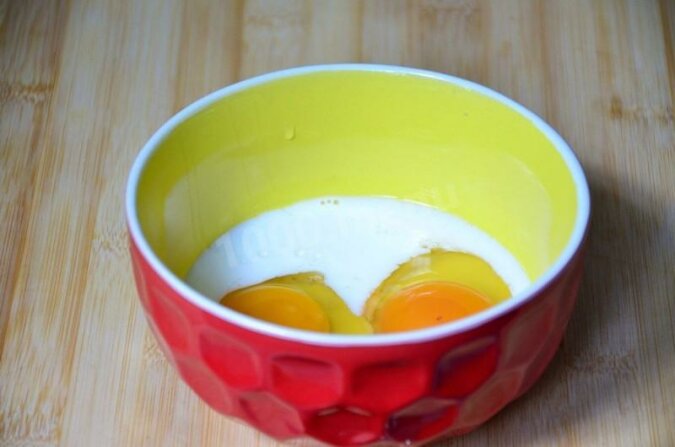 Najpierw należy usmażyć naleśniki. Więc, 2 jajka lekko ubijamy z mlekiem (2 łyżki), a następnie dodajemy sól i pieprz do smaku.