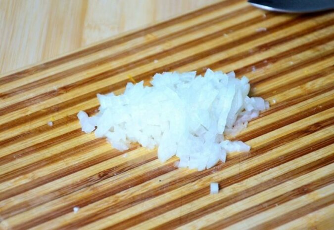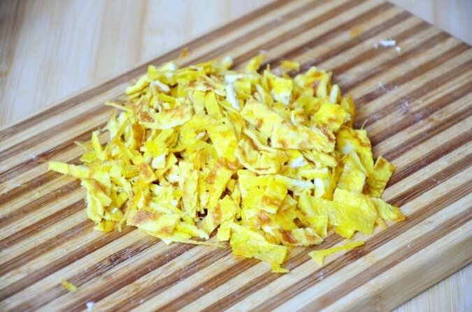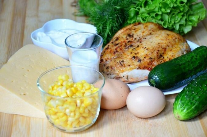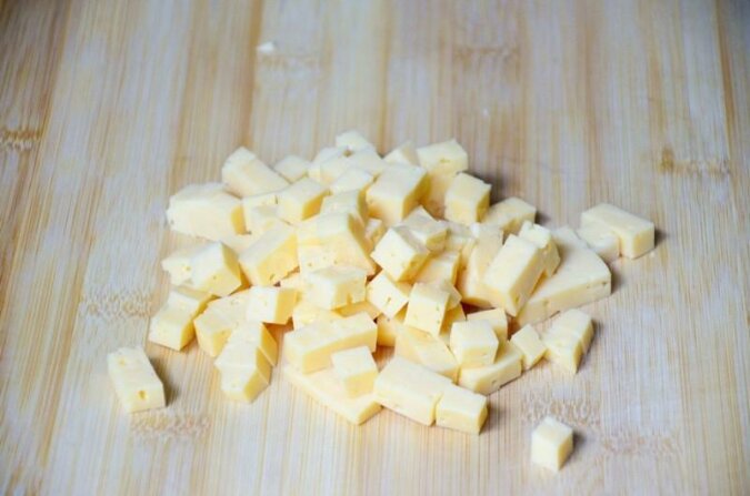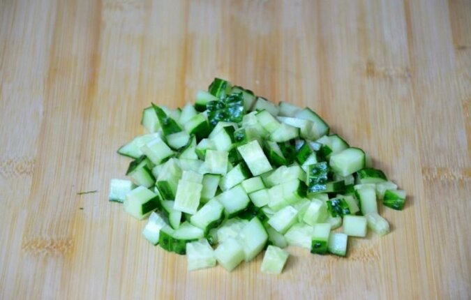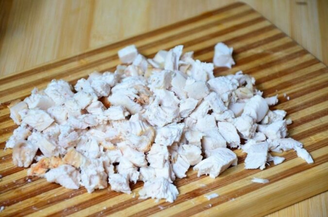 Także filet z pieczonego kurczaka należy pokroić w kostkę. Nawiasem mówiąc, jeśli nie ma czasu na pieczenie lub gotowanie kurczaka, można go zastąpić wędzoną piersią lub szynką.