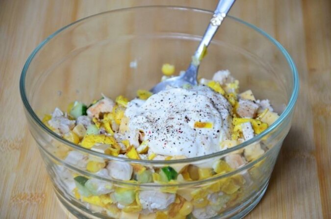 Teraz należy wymieszać wszystkie składniki w misce, a następnie dodać 1 łyżkę majonezu lub śmietany, a także dodać sól i pieprz do smaku. Wszystko dokładnie wymieszać.