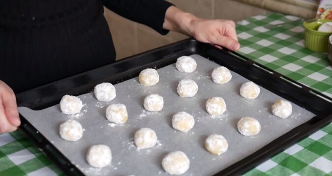 Każdą kulkę ciasta delikatnie posyp sproszkowanym cukrem, a następnie ułóż na blasze wyłożonej pergaminem.