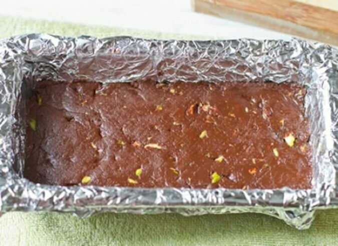 4. Formę przykryj folią aluminiową i wlej do niej mieszankę czekoladowo-orzechową i ostudź do temperatury pokojowej.