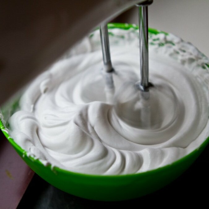 1. Ubij śmietankę i powoli dodawaj do niej wiórki kokosowe oraz oba cukry.