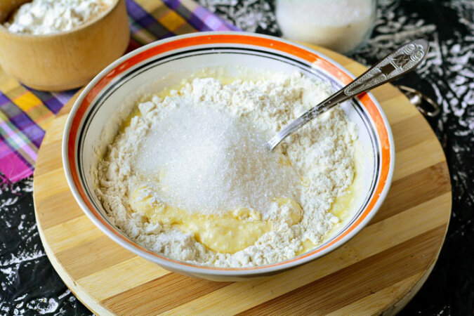 4. Następnie należy dodać cukier, aby ciasto było słodkie i smaczne.