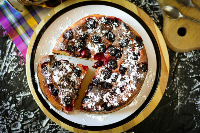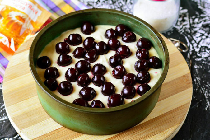 6. Naczynie do pieczenia napełnić masą i ułożyć losowo świeżą wiśnię bez pestek.