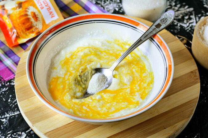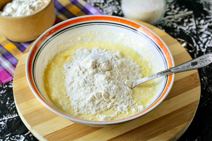 2. Dodać proszek do pieczenia i ponownie wymieszać. Z proszkiem do pieczenia ciasto stanie się puszyste. 3. Dodać przesianą mąkę pszenną.