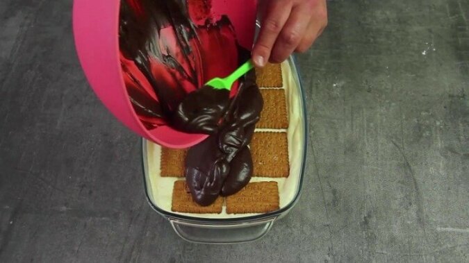 Kontynuuj układanie ciastek/herbatników i kremu warstwa po warstwie. To domowe ciasto bez pieczenia pozostawia miejsce na kreatywność: można dodać banany, orzeszki ziemne, trochę skondensowanego mleka ... Chce się wypróbować wszystkie możliwe opcje!