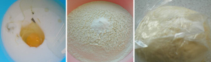 Przesianą mąkę i sodę wymieszaj z kefirowo-jajeczną masą. Dodawaj mąkę porcjami, tak aby ciasto był elastyczne. Gotowe ciasto zawiń w folię i odstaw na 30 minut.