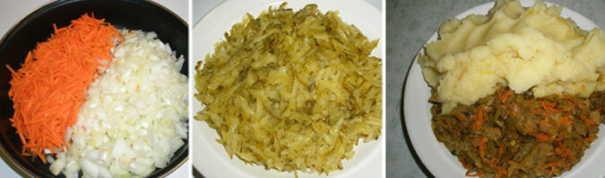 Marchewkę zetrzyj na tarce, cebulę pokrój na kostkę. Podsmaż warzywa na oleju roślinnym, aż się zarumienią.