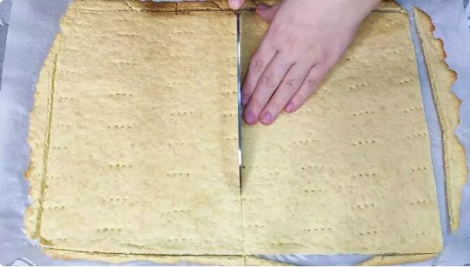 Przetnij gotowe ciasta nożem z każdej strony, aby były równe. Następnie podziel na dwie części.