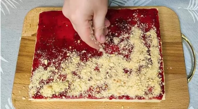 Ciasto przykryj dżemem na wierzchu i posyp okruchami ze skrawków, które wcześniej zmielisz.