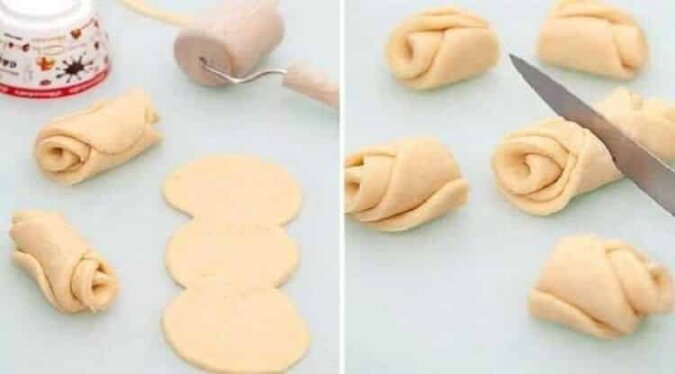 Ciasto zagnieść, niezbyt cienko rozwałkować i szklanką wyciąć z niego kółka.