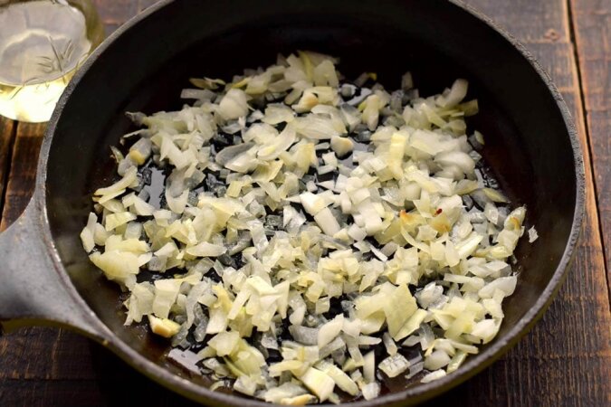 3. W tym czasie przygotuj nadzienie. Cebulę obierz, pokrój w kostkę, połóż na rozgrzanej oleistej powierzchni patelni, smaż 3 minuty do gotowości.