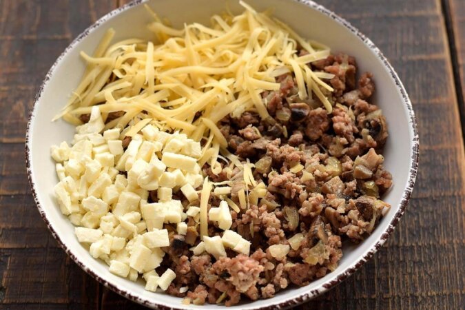6. Zetrzyj twardy ser na grubej tarce, pokrój ser mozzaralla w drobną kostkę. Wymieszaj dwa rodzaje sera ze smażoną mieszanką w jednym pojemniku. W razie potrzeby dodaj przyprawy.