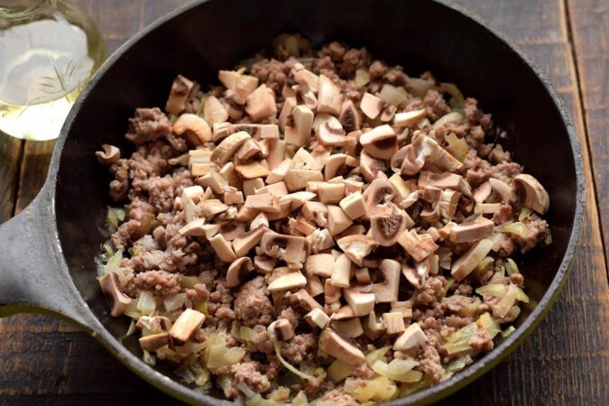 5. Pieczarki opłucz, drobno posiekaj, włóż na patelnię z mięsem mielonym i cebulą. Smaż mieszaninę często mieszając, aż płyn całkowicie wyparuje. Dopraw solą i pieprzem do smaku. Po usmażeniu ostudź nadzienie.