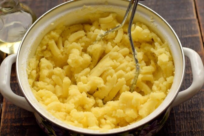 Ugotowane ziemniaki trochę ostudzić, obrać ze skórki, zmiażdżyć na jednorodne puree.