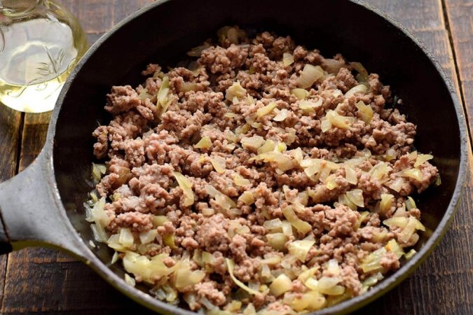4. Dodaj mięso mielone do cebuli, smaż dalej przez 7-10 minut na średnim ogniu, ciągle mieszając, aby duże kawałki mielonego mięsa rozpadły się na mniejsze kawałki.