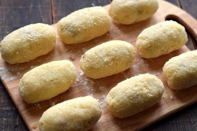 8. Przykryj nadzienie ciastem ziemniaczanym, formując podłużne klopsiki. Zanurz je w bułce tartej, obtocz ze wszystkich stron.