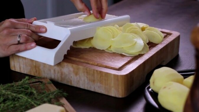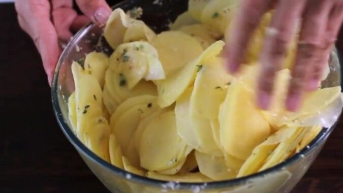 Drobno obrane i umyte ziemniaki kroimy w cienkie plastry, następnie mieszamy je z roztopionym masłem, częścią parmezanu i przyprawami.