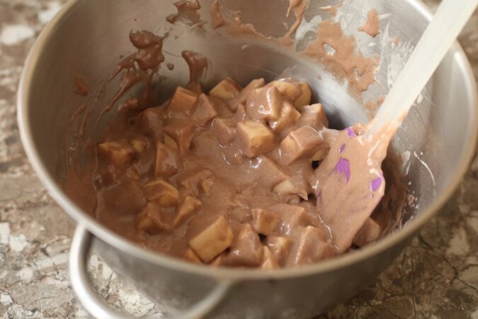 Do ciasta dodaj przygotowane jabłka i wymieszaj.