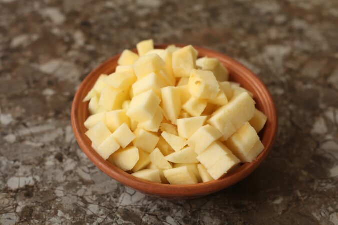 Jabłka obrać i wydrążyć środek, pokroić w drobną kostkę lub plastry - według uznania.