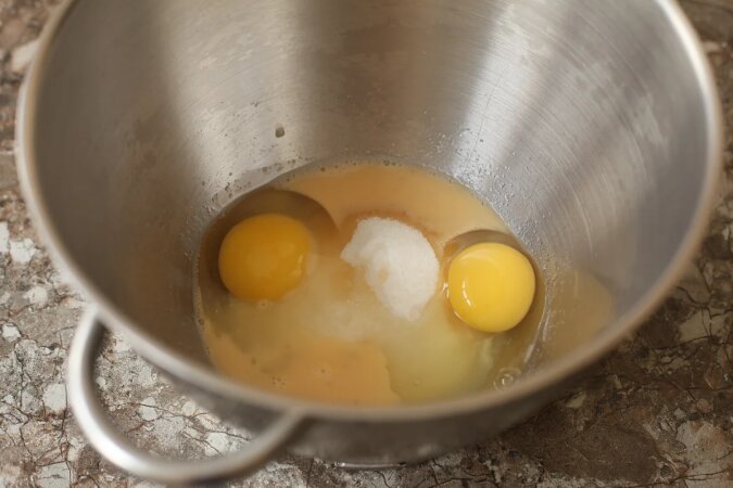 Wrzuć więc jajka do głębokiej miski, wygodnej do ubijania. Wsyp cukier, dodaj sól i wanilinę (lub 10 g cukru waniliowego).