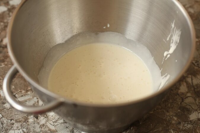 Ubij wszystko mikserem przez 5-7 minut, aż masa stanie się biała, błyszcząca i przewiewna. Wlej olej roślinny i ubijaj przez chwilę.