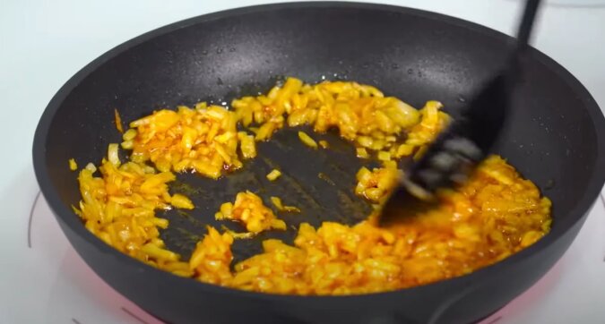 A drugą połowę smażę na małej ilości oleju, aż będzie przezroczysta. Następnie dodaję paprykę, mieszam i od razu zdejmuję patelnię z ognia.
