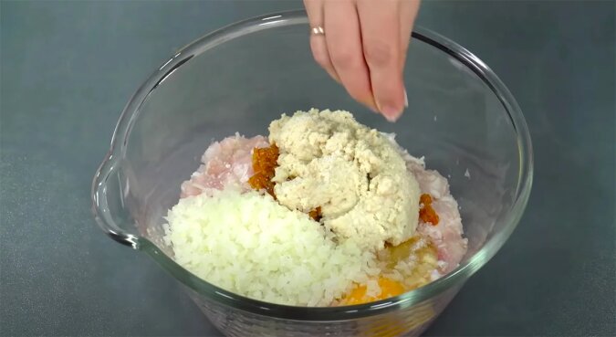 W misce łączę mieloną rybę, świeżą cebulę, smażoną cebulę i kilka kromek chleba (wcześniej zalewam chleb mlekiem i ugniatałam rękami). Zamiast chleba możesz wziąć płatki owsiane i zmielić je w blenderze. Dodaję do tego jajko, przyprawy i sól. Mieszam wszystko.