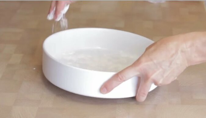 1. Weź żaroodporne naczynie o średnicy 24 cm, posmaruj dno i boki olejem. Na wierzchu posyp cukrem pudrem.
