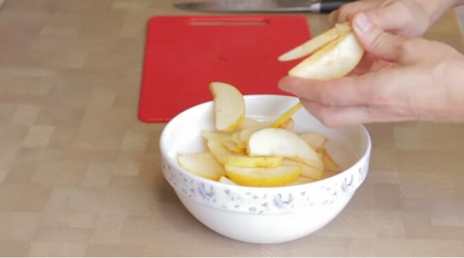3. Umyj jabłka, usuń rdzeń, pokrój w ćwiartki. Skrop sokiem z cytryny, aby zapobiec czernieniu.